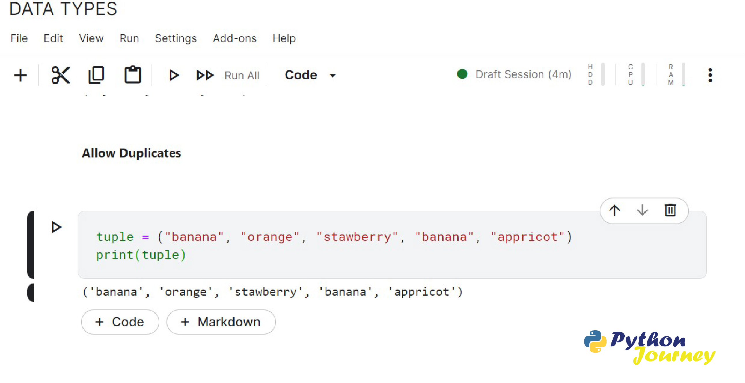 A tuple is one of the 4 built-in data types in Python for storing collected data, the other 3 being List, Set, and Dictionary, all with different types and functions.